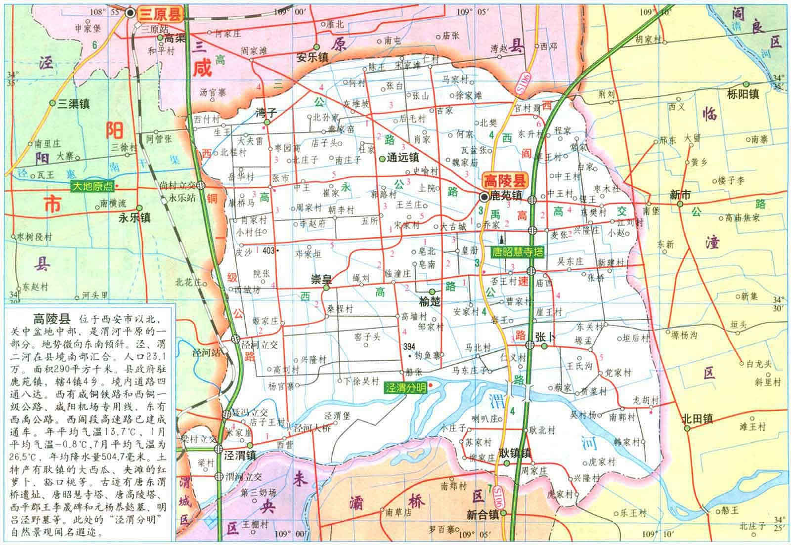 高陵縣地勢(shì)平坦,土壤肥沃,人稱關(guān)中的“白菜心”。東靠臨潼區(qū),南接未央、灞橋區(qū),西連咸陽(yáng)渭城區(qū)、三原縣、涇陽(yáng)縣,北臨閻良區(qū),屬西安市近郊縣,距西安市中心僅20公里,距咸陽(yáng)國(guó)際機(jī)場(chǎng)10公里。涇渭二水橫貫東西,西禹、西銅高速公路、210國(guó)道及西延鐵路橫貫?zāi)媳保瑳芎踊疖囌疚挥谄渲小?ldquo;五區(qū)、二水、四線”已緊密地把高陵縣與西安市融為一體。