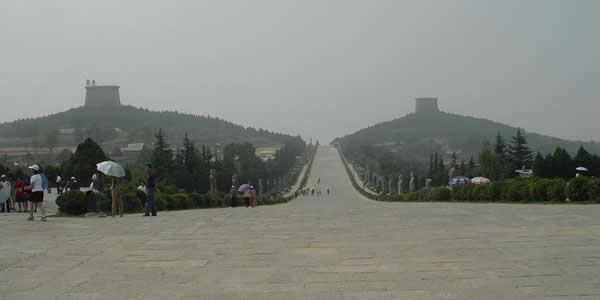 此景距縣城6公里,與乾陵渾然一體,乾陵朱雀門(mén)南面從兩乳峰之間通向獻(xiàn)殿的御道兩側(cè),豎有華表,石馬(翼馬)、駝馬、翁仲、述圣紀(jì)碑、無(wú)字碑、石獅、六十一賓王等大型精細(xì)石雕,120多尊依次排列。石馬在前,雙翅高振,凌空欲飛,栩栩如生,其他石雕左右配置,緊隨其后,魁梧奇?zhèn)ィ瑲庀笕f(wàn)千,被史學(xué)界譽(yù)為“唐代露天石雕藝術(shù)博物館”。近年來(lái),國(guó)家文物旅游局又投巨資,對(duì)34尊石雕扶直加固,對(duì)御道鋪石美化,使此景更加恢宏壯觀。