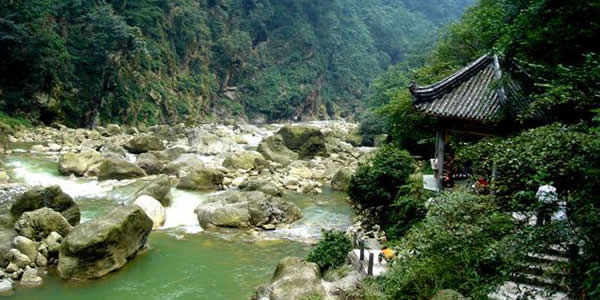 九龍溝:位于崇州市西北三郎鎮(zhèn),因“九溝九槽九條龍”的神話傳說(shuō)而得名。這一地區(qū)為龍門山脈口段前斷裂帶,地質(zhì)構(gòu)造復(fù)雜,群山在海拔700米到3868米之間起伏變化,相對(duì)高差懸殊較大,懸崖陡峭,多飛瀑迭湍、深溝狹谷,有眾多的酷似龍形的奇峰怪石和飛瀑流泉。九龍溝內(nèi)水石相擊之聲如龍吟似龍嘯,巨石躺臥之狀如龍盤似龍睡,山峰聳立之形如龍騰似龍臥,簡(jiǎn)直就是活生生的“人間龍宮”。崇州百姓中流傳有“九條龍從九龍池出游,在九龍山會(huì)合,回九龍溝安家,并在龍?zhí)蚴狭粝戮艤暇挪劬艞l龍”的神奇?zhèn)髡f(shuō)。九龍溝景區(qū)面積175平方公里,其中游覽面積32平方公里,由九龍溝水石景區(qū)、大西山原始森林景區(qū)和古寺等三部分組成,以九龍溝動(dòng)態(tài)水石景觀最引人入勝,是風(fēng)景區(qū)的主要部分,有化石巖、珍珠泉龍石巖、龍女浣紗池、龍?zhí)蚴€@天峰、響水溝、九龍飛瀑等景觀,其中龍女融積雪而成的“九龍飛瀑”,寬10余米,高100余米,是成都地區(qū)不可多見(jiàn)的大瀑布。密林中隱藏著雄偉的古剎,是成都地區(qū)山林中保存較完好的規(guī)模較大的古廟。