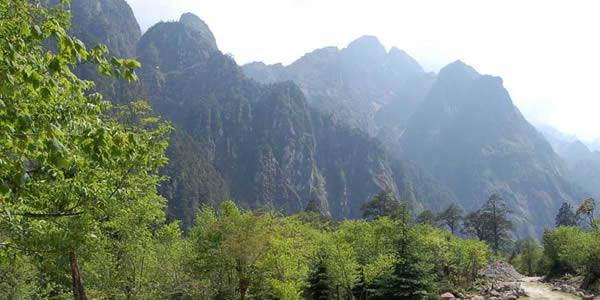 山上的原始森林除了松、杉、樺外,還有珍貴的珙桐、樟和楠木,山上各色野花爭奇斗艷,更有那四季輪流開放的三、四十種杜鵑。從山腳往上,一路景色,變化萬千.山腳溪水潺潺,岸芷汀蘭;山腰花紅柳綠,草木蔥蘢;高山霜葉片片,層林玉樹瓊枝,晶花、夏綠、秋實、冬雪之風光于一處,融自然之美景于一山。自道貫通路便可成為一條很好的游山道。