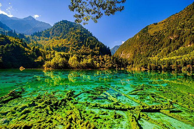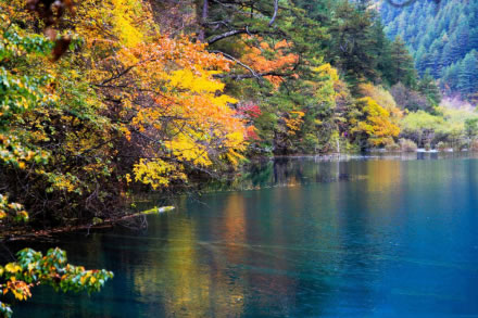 浪漫的秋風也吹來了九寨溝最為燦爛的時節(jié)。山林暈染成色,除了綠色以外,還呈現(xiàn)出金黃、火紅等色彩,五彩繽紛,倒映在明麗的湖水中,湖山同色,湖水也斑斕似錦了,一時間竟然不能分清哪里是山哪里是水,十分迷人。