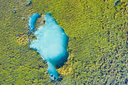 嫩芽悄然出現(xiàn),一抹抹新綠因重獲生機而生長得日益茂盛,春風吹醒了封凍的海子,吹皺了一汪碧水,水色是幽靜的藍、清新的綠、淺淺的黃。無風的晴日,山林樹色盡數(shù)倒映其中,呈現(xiàn)出對稱之美。