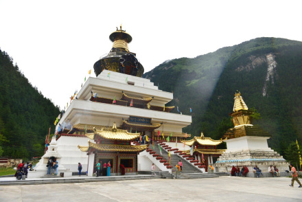 目前,九寨溝景區(qū)僅保留了樹正寨、荷葉寨、則查洼寨這三個村寨,善良淳樸的他們,用微笑迎接著前來九寨溝的每一個人。而在這些村寨中,最壯觀的莫過于樹正寨前的“九寶蓮花菩提塔”,七彩經(jīng)幡隨風飄蕩,圣潔的白塔在陽光下仿若閃著光,這里也是眾多游客到來時,都會雙手合十,輕聲祭拜的地方。