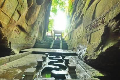 仿照東晉書法家王羲之蘭亭集會流觴曲水的意境,黃庭堅利用這峽谷的地形和天然泉水,修建了900多年來遐邇聞名的流杯池。保持其天然的山水景致是文人造園崇尚自然的山水理念,流杯池內(nèi),從谷底到崖壁頂,蜿蜒臺階而上,幾個平臺錯落其間,時而寬敞平緩,時而臨崖高懸,這樣的美景是黃庭堅在領(lǐng)會自然美的規(guī)律上進行的藝術(shù)再創(chuàng)造。