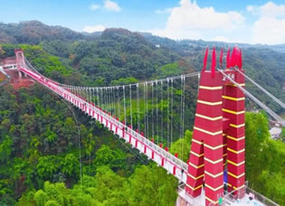 七洞溝9D云海玻璃橋橫騎南屏山山脈與佛來山山脈峽谷之上,全長386米,寬3.3米,垂直落差188米,在中國西南部地區(qū)長、寬、高都名列第一,是長寧旅游大發(fā)展靚麗新畫卷之一。玻璃橋采用最新9D技術(shù),以仿真場景與感應(yīng)設(shè)置模擬多種特殊效果、立體畫面,將視覺、聽覺、觸覺和動(dòng)感完美地融為一體,給游客帶來驚心動(dòng)魄的刺激感受。走在橋上,不僅可以俯瞰綿溪河,還可以飽覽南屏山脈、佛來山脈等2座群山的英姿;晴天時(shí),藍(lán)天和白云的倒影鋪滿天橋,讓人在對透明的腳下戰(zhàn)戰(zhàn)兢兢之余,更樂享于踏云而行的快感;而云霧天氣時(shí),玻璃橋則在霧中若隱若現(xiàn),天上人間的美景更是讓人驚嘆不已。