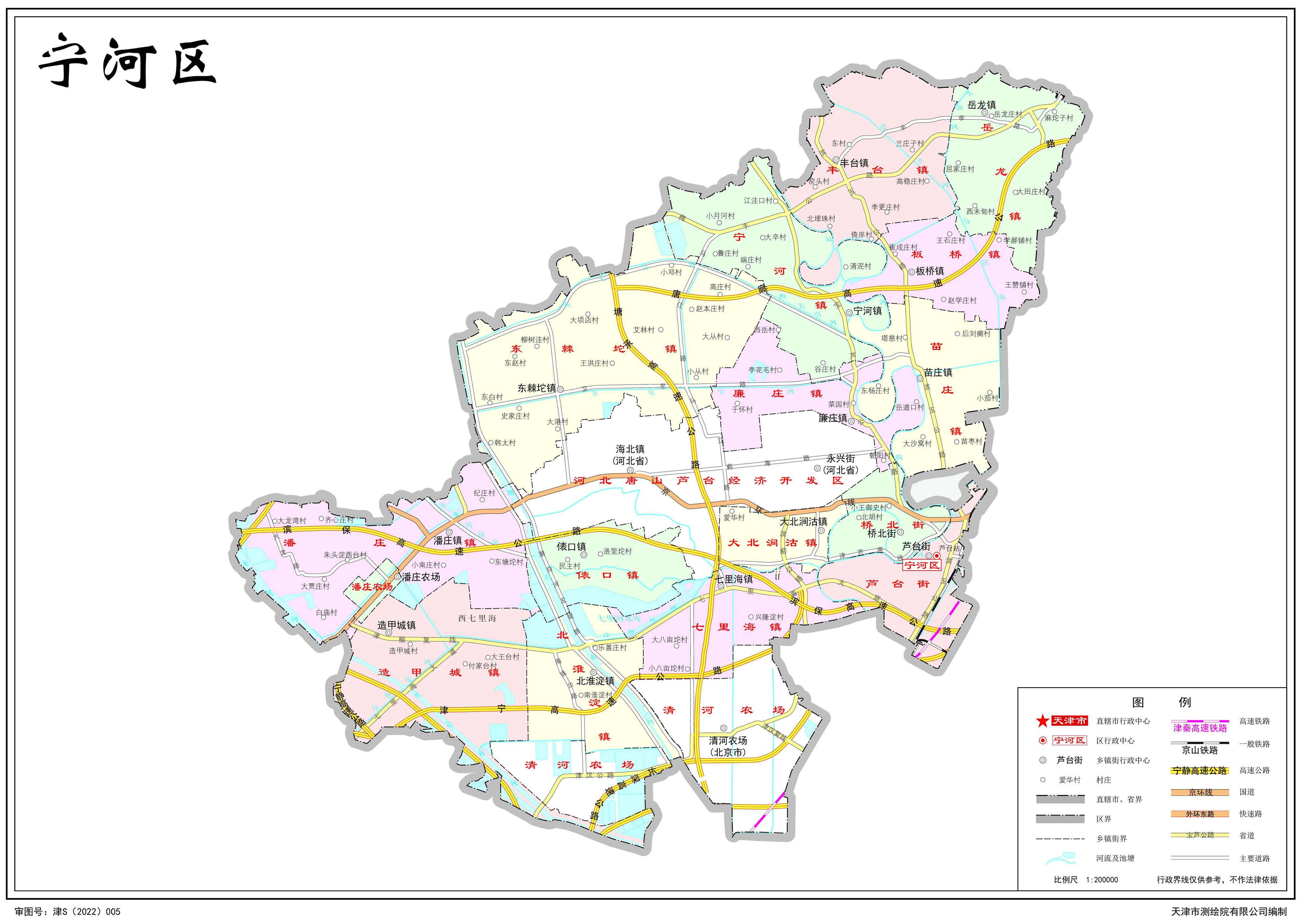 鎮(zhèn):寧河鎮(zhèn)、苗莊鎮(zhèn)、豐臺鎮(zhèn)、岳龍鎮(zhèn)、板橋鎮(zhèn)、潘莊鎮(zhèn)、造甲城鎮(zhèn)、七里海鎮(zhèn)、大北澗沽鎮(zhèn)、東棘坨鎮(zhèn)、北淮淀鎮(zhèn)、俵口鎮(zhèn)、廉莊鎮(zhèn)