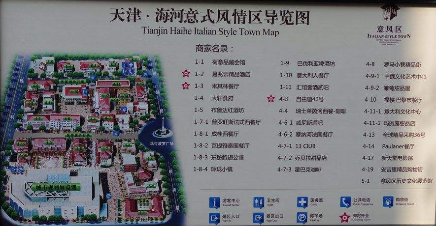 意式風(fēng)情區(qū)內(nèi)包含河北區(qū)進(jìn)步道、民族路、民主道、民生路、自由道、光復(fù)道、光明道等多條道路,是意大利在境外唯一的租界,亦是一處具有意大利風(fēng)格的大型建筑群。有梁啟超、曹禺、張廷諤、曹錕、袁世凱、齊耀珊、張學(xué)銘、曾國藩家族、馮國璋、李叔同、湯玉麟、盧鶴紱、王卓然、劉髯公、程克、鮑貴卿、華世奎、易兆云、李廷玉、張鳴岐、李文田、章宗祥、孫良誠、倪嗣沖、段芝貴、王一民、王郅隆、黃郛、曹銳、盧木齋、鄭誦先、黎元洪、安文忠、楊以德、齊耀琳、呂調(diào)元、靳云鵬、龔心湛、王占元等多處中國名人故居。