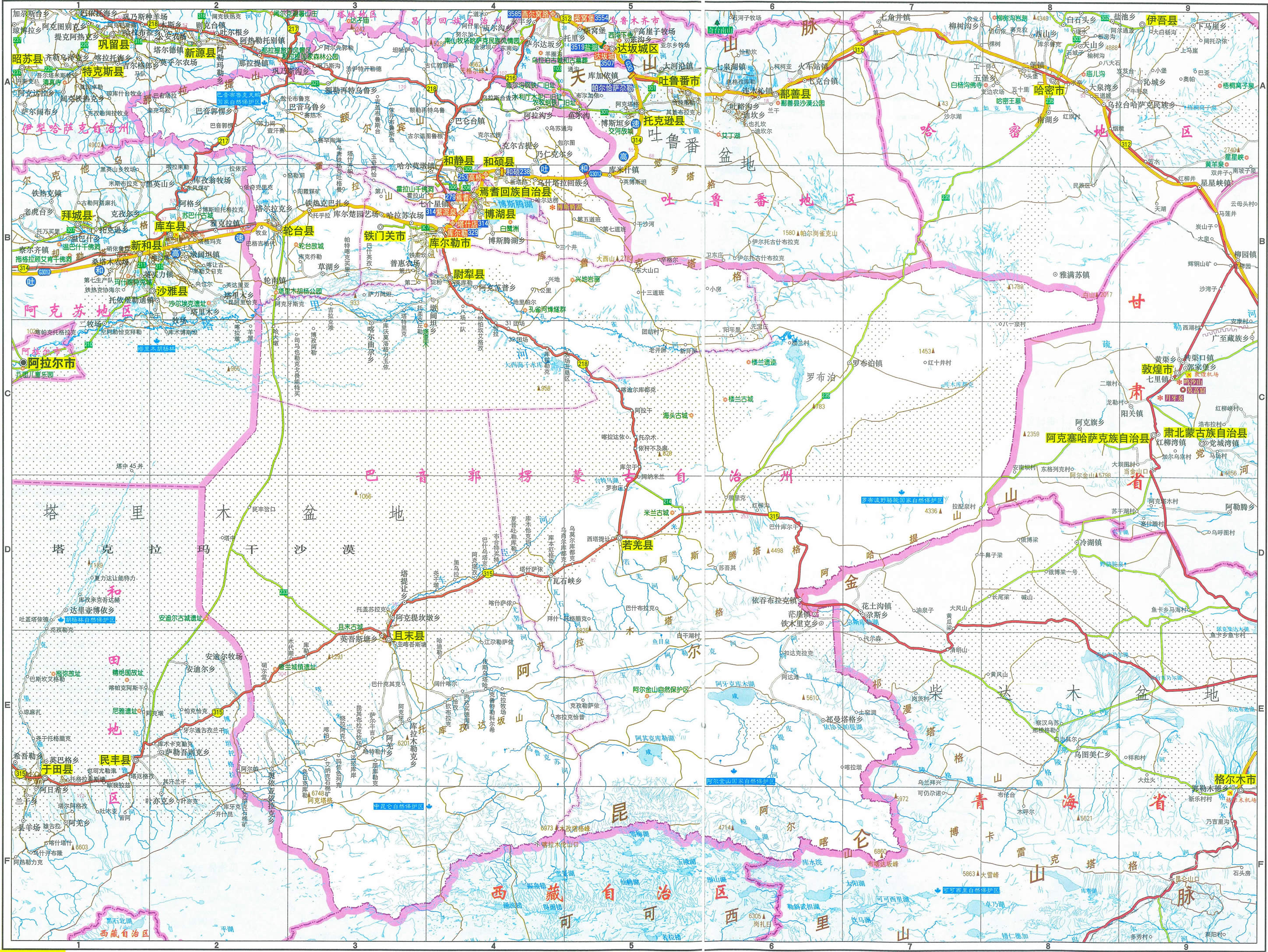 巴音郭楞蒙古自治州轄1個(gè)縣級(jí)市、7個(gè)縣、1個(gè)自治縣: