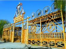 風(fēng)格獨(dú)特、氣勢(shì)宏偉的大門(mén)就是刀郎人民俗村寨門(mén)。造型似刀郎人英雄男兒形象,體現(xiàn)刀郎人的勇敢彪悍、不屈不撓、勤勞智慧、熱愛(ài)子民的硬漢精神。