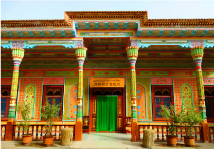 這座民族特色濃郁,極具刀郎人建筑風(fēng)格的宴藝廳就是刀郎部落招待貴賓及聚會(huì)、就餐、欣賞刀郎歌舞的場(chǎng)所。餐廳裝飾工藝主要為刀郎人傳統(tǒng)的石膏雕、木雕和磚雕。墻面上色彩艷麗,植物花卉圖案的是石膏雕,回廊上的木柱子為木雕,據(jù)說(shuō)這樣的一根柱子需要兩個(gè)工匠花一個(gè)月時(shí)間才可完成。屋檐最上面一層為磚雕。刀郎部落宴藝廳可容納300人就餐,在品嘗地道刀郎美味的同時(shí)還可欣賞刀郎歌舞表演。