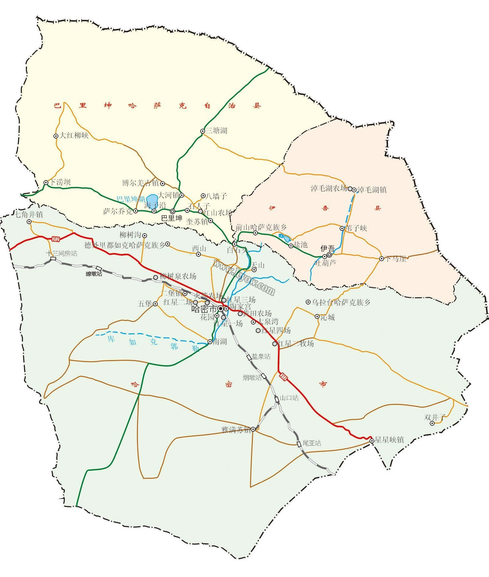 伊吾縣 面積19519平方千米,人口21070,政府駐伊吾鎮(zhèn),下轄3個(gè)鎮(zhèn)、4個(gè)鄉(xiāng)