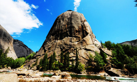 神鐘山,又名阿米爾薩拉峰,為一座如鐘似錐的花崗巖奇峰,在額河南岸平地拔起,海拔1608米,相對高差達365米,為阿爾泰山山景之最。巖壁縫上生長著白樺樹、青松和西伯利亞云杉。因巖體發(fā)育平行山坡面的同心圓層狀節(jié)理,受寒凍風(fēng)化作用,沿平行坡面的節(jié)理不斷地拆離崩解垮塌,使山峰的表面既圓潤平滑,又十分陡峭,從而形成鐘狀地貌。