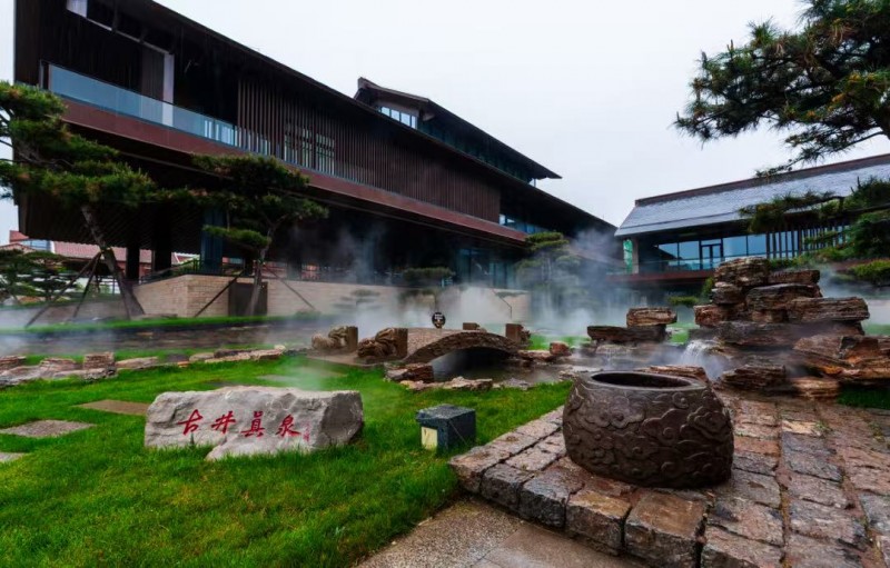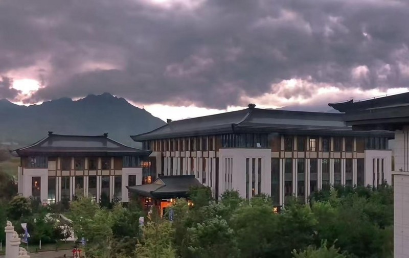 那白,不再是日光下格外耀眼的白,而是閃著被雨水調和了的,一種溫潤如玉的光澤;那瓦,也不再是樸素的灰,而是透著水光,泛著烏亮的顏色,像巨鳥收斂的羽翼,沉靜地棲息著。松風館靜默在青松的環(huán)抱里,雨水順著松針的尖端,凝成一顆顆晶瑩的,欲墜未墜的珠子。遠遠望去,太行山原本雄渾蒼勁的輪廓,在雨幕里漸漸化作宣紙上暈開的青黛,而繚繞的云霧,恰似畫家筆下有意無意的留白。此刻,唯有雨水從高處滴落,敲在石上、葉上的聲響,正應了那句“青松凝露翠,寒色隱泉聲”的幽靜與禪意。