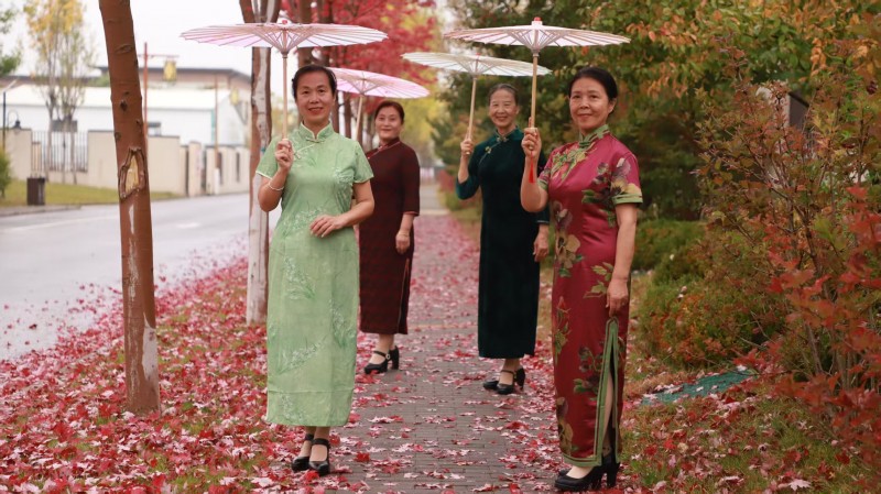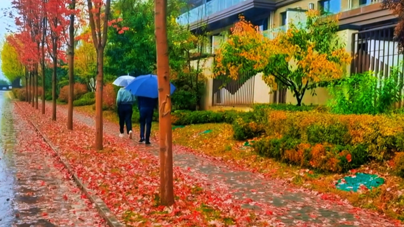 小鎮(zhèn)的雨,是天地間最奇妙的調色盤,它懂得用豐富的色彩調和季節(jié)的輪回。打濕銀杏時,雨便成了金黃;灑落楓樹時,雨便成了火紅;浸潤松柏時,雨又化作濃綠……長街、小路被洗的油亮,早落的黃葉,粘在濕漉漉的石面上,像一枚精致的書簽,應和著“秋雨梧桐葉落時”的意境;路上的行人并不匆忙,而是踏著雨聲的節(jié)拍,在“斜風細雨不須歸”的悠然中,邂逅墻角那叢“菊散金風起”的絢爛。偶有身著旗袍的女子,撐一把油紙傘,在飄落一地的紅楓葉上款款漫步。那身影穿過雨幕,恍若從水墨長卷中走出的意象,在現實與夢境之間翩翩起舞;雨聲里飄來山居食堂的暖香,水汽與雨霧在空中交融,織就“寒夜客來茶當酒”的溫潤時光。