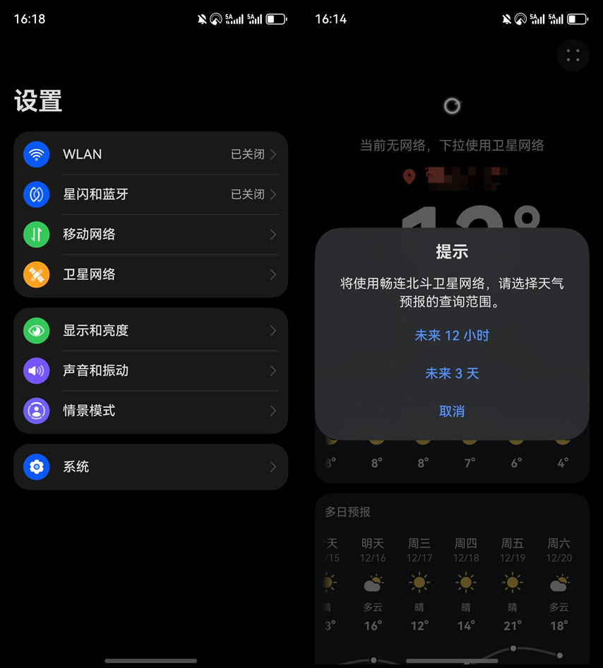 哪怕營地完全沒有信號(hào),現(xiàn)在也不用慌。有網(wǎng)絡(luò)時(shí)提前在設(shè)置-衛(wèi)星網(wǎng)絡(luò)里打開“暢連北斗衛(wèi)星消息”后,我可以切換到衛(wèi)星網(wǎng)絡(luò)模式,能查看未來12小時(shí)、最長3天的天氣數(shù)據(jù)。手里有這個(gè)戶外神器,再也不必?fù)?dān)心與世隔絕和天氣突變了。