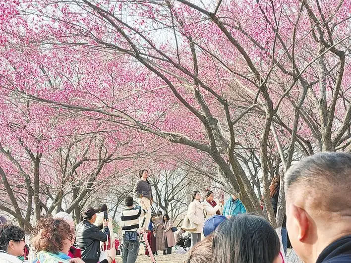 記者踏上緩坡,越往坡頂走,人氣越旺,花香愈濃,蜜蜂翻飛于花枝之間。這片占地約8000平方米的坡地上,栽植著紅梅、宮粉梅、綠萼梅、白梅等4個(gè)品種共500余株梅樹。坡頂北側(cè)光照充足,上百株紅梅與宮粉梅已競相開放,匯成一片絢爛的“粉色云霞”,與南側(cè)尚在蓄蕾、點(diǎn)點(diǎn)白梅吐蕊的靜謐景象相映成趣。