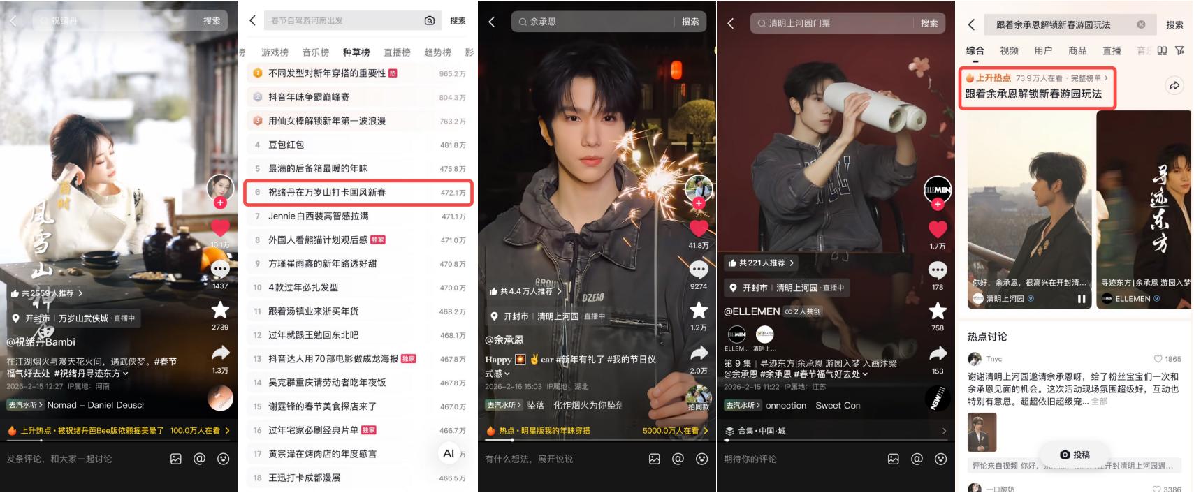 同樣的邏輯也在清明上河園得到了驗證。通過聯(lián)動余承恩開啟#跟著余承恩解鎖新春游園玩法 的宣發(fā),景區(qū)不再是一個靜態(tài)的游覽點,而變成了一個可互動、可沉浸的“大型劇本殺”現(xiàn)場。這種結合雜志感視頻與藝人視角的傳播方式,讓相關內容累計曝光量突破10億,讓“去開封過年”從一個選項變成了一種風潮,抖音生活服務通過這種極具穿透力的內容打法,為景區(qū)建立了極強的搜索權重與心智溢價。