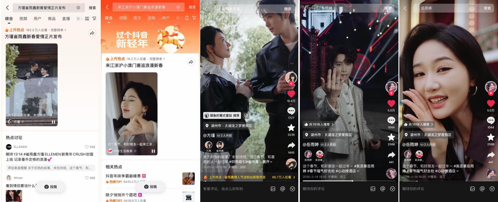 微短劇《這個春節(jié),和“xx”一起過年》,讓太湖龍之夢在這個春節(jié)多了一層身份,它不只是景區(qū),更是演員們演繹人間煙火的敘事背景。太湖龍之夢與抖音生活服務深度合作,讓岳雨婷、崔雨鑫等演員拍攝系列微短劇,把龍之夢“江浙滬小澳門”的社交標簽,打碎了揉進愛情與友情的敘事褶皺里。