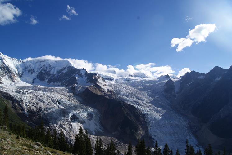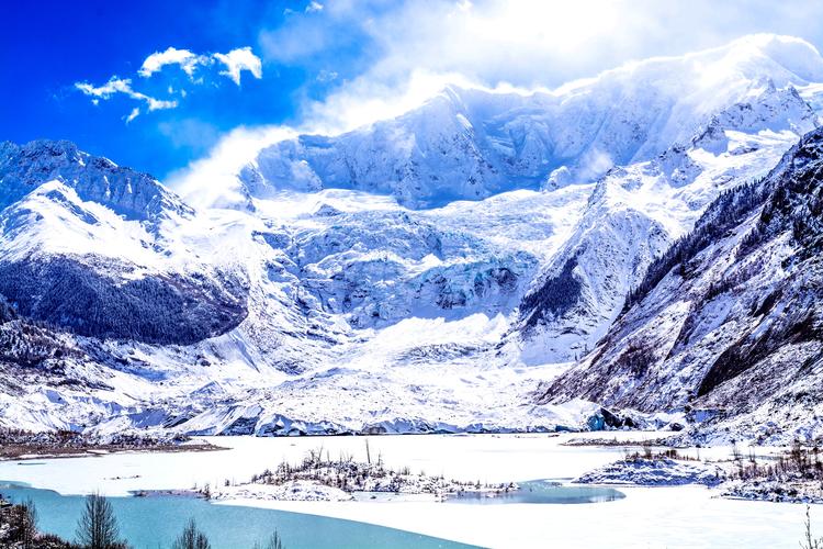 該冰川常年雪光閃耀,景色神奇迷人。這是典型的現(xiàn)代季風(fēng)型溫性冰川,類型齊全,尤以巨大的冰盆、眾多雪崩、陡峭巨大700-800米的冰瀑布、消融區(qū)上游的冰面弧拱構(gòu)造以及冰川末端冰湖和農(nóng)田、村莊共存為特點(diǎn)。