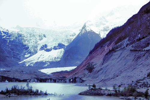 離開(kāi)川藏公路,過(guò)了新建的橫跨額公藏布江公路橋后,只見(jiàn)一條兩面均是懸崖絕壁的峽谷,沿著小河修建的村道僅能通過(guò)一輛車(chē),再走幾公里后,突然出現(xiàn)大片寬闊的谷地,遠(yuǎn)處兩條壯觀的冰瀑布掛在雪峰與森林之間,猶如兩道由天而下的巨大銀幕……要與米堆冰川做近距離接觸的話,還要徒步走進(jìn)層林盡染的森林,翻越三道冰川運(yùn)動(dòng)留下的終磧垅。當(dāng)走上第三個(gè)終磧垅時(shí),一個(gè)冰湖出現(xiàn)。冰湖的另一端有一道寬近兩米、高達(dá)十?dāng)?shù)米的斷裂的冰舌,發(fā)出幽幽的藍(lán)光。從天而下的冰瀑布在陽(yáng)光下閃著銀色的光芒,近800米的落差讓人感到一陣暈眩。一陣陣從冰川上吹來(lái)的寒風(fēng)迎臉撲來(lái),在強(qiáng)烈的陽(yáng)光下,還是讓人不寒而栗。