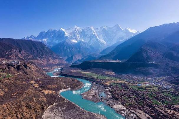 從空中或從西興拉等山口鳥瞰大峽谷,在東喜馬拉雅山無數(shù)雪峰和碧綠的群山之中,雅魯藏布江硬是切出一條筆陡的峽谷,穿越高山屏障,圍繞南迦巴瓦峰作奇特的大拐彎,南瀉注入印度洋,其壯麗奇特無與倫比。