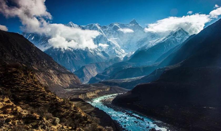 雅魯藏布江大峽谷兩側,壁立高聳的南迦巴瓦峰(海拔7782米)和加拉白壘峰(海拔7234米),其山峰皆為強烈上升斷塊,巍峨挺拔,直入云端。峰嶺上冰川懸垂,云霧繚繞,氣象萬千。