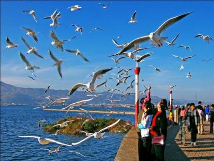 滇池位于昆明市南的西山腳下,其北端緊鄰昆明市大觀公園,南端至晉寧縣內,距市區(qū)5km,歷史上這里一直是度假觀光和避暑的勝地。滇池形似弦月,南北長39km,東西寬13.5km,平均寬度約8km。湖岸線長約200km;湖面面積300k㎡,居云南省首位,湖水最大深度8m,平均深度5m,蓄水量15.7億,素稱“五百里滇池”。是中國第六大內陸淡水湖。