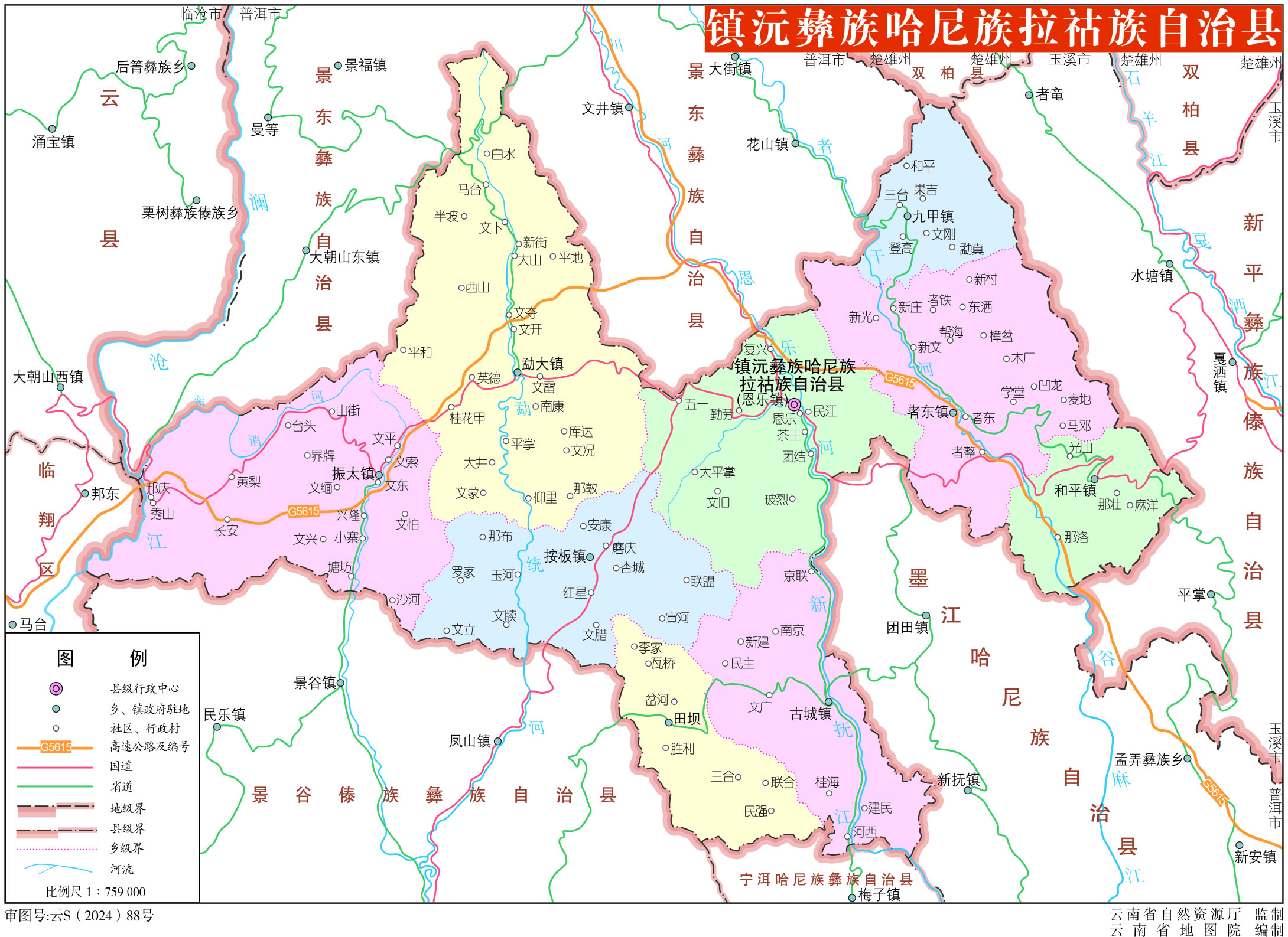 鎮(zhèn):恩樂鎮(zhèn)、按板鎮(zhèn)、勐大鎮(zhèn)、者東鎮(zhèn)、振太鎮(zhèn)、九甲鎮(zhèn)、古城鎮(zhèn)、和平鎮(zhèn)