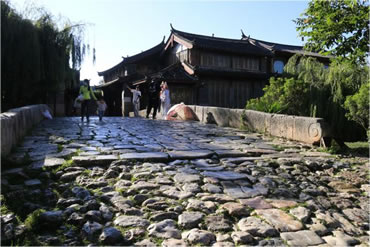 進(jìn)入束河村,你可直抵束河中心集市,在這里你會(huì)有一種似曾相識(shí)的感覺(jué),這是一個(gè)類(lèi)似大研鎮(zhèn)古城四方街的廣場(chǎng),面積約250平方米,亦稱(chēng)束河四方街,趕集的日子里異常熱鬧,曾是麗江皮毛交易集散之地。廣場(chǎng)四周均為店鋪,古老的木板門(mén)面,暗紅色油漆。還有店前黑亮的青石,腳下斑駁的石坡路面,以及閑坐的老人,勾勒出束河古樸自然本色。站在廣場(chǎng)中心,你細(xì)細(xì)觀察體會(huì),大研古城四方街完全是束河的翻版,納西民族由游牧向農(nóng)耕,再走向城市,從這里你可找出一些痕跡。沿束河街北走100米,便可找到溪流的源頭“九鼎龍?zhí)丁,潭水透明清澈,日夜涌泉,束河人奉為神泉,于是建有龍泉寺?/p>