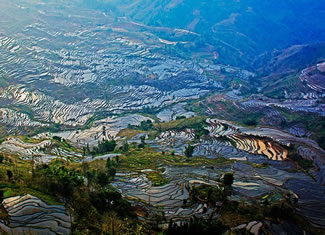 哈尼族墾殖梯田的想象力令人驚絕,其隨山勢(shì)地形變化,因地制宜,坡緩地大則開(kāi)墾大田,坡陡地小則開(kāi)墾小田,甚至溝邊坎下石隙之中,無(wú)不奮力開(kāi)田,因而梯田大者有數(shù)畝、小者僅有簸箕大,往往一坡就有成千上萬(wàn)畝。這一景觀構(gòu)成了千奇百態(tài)變幻莫測(cè)的天地藝術(shù)大交響樂(lè),成為舉世矚目的梯田奇觀。