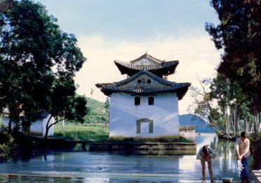 金蓮捧日舊八景稱“牢莊晚照”,系指澂江壩子?xùn)|部,舊城旁邊的金蓮山。這座山,古稱牢莊山或龜山,此山高圓平整,眾山環(huán)拱。當(dāng)夕陽(yáng)西墜,惟此山紅光映照,燦若星辰,又因山上遍長(zhǎng)野金蓮花,與夕照相輝映,猶似金蓮捧日而得名。