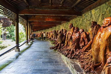以根雕藝術(shù)展現(xiàn)佛教文化的圣地,是由千年樹神匯聚的藝術(shù)殿堂,建筑面積1.2萬平方米,縱深有三座大殿,第一幢為雙層結(jié)構(gòu),第二第三幢均為單層結(jié)構(gòu)。兩邊另有羅漢文化長廊依山而建,環(huán)繞其間,有未來佛殿、大雄寶殿、羅漢堂等,陳列有釋迦牟尼、未來佛、四大菩薩、四大天王、五百羅漢等佛教文化系列巨型根雕作品一千余件,其中最大的根雕釋迦牟尼主佛,形體龐大,重達(dá)40余噸,根材花巨資,于中緬邊境一路繞道跋涉而來,經(jīng)醉根“點化”,巍然成佛!五百羅漢陣更是氣勢雄偉,長達(dá)680余米,整體布局渾厚古雅,堪稱中華一絕、世界之最。