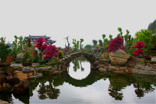 地處根宮佛國文化旅游區(qū)山麓,緊依根雕佛國,有醉松亭、日月亭、回思廊、靜心亭、樂禽園等景觀建筑,陳列有以松柏類為主的盆景藝術(shù)作品1500余盆,造型博采眾長,創(chuàng)意自然,有小橋流水田舍人家的水旱盆景,有濃縮華山天險附石盆景,有的以石為盆回歸自然,有的三五成林意境高遠(yuǎn),大自然的千奇百怪,于方寸間一覽無余,具有空中花園美譽。