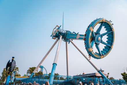 天旋地轉(zhuǎn),陀螺儀類型游樂(lè)設(shè)施,高度16米,同時(shí)乘坐26人。當(dāng)轉(zhuǎn)臂與搖臂的轉(zhuǎn)速、旋轉(zhuǎn)方向在連續(xù)變化時(shí),座椅以前后、上下、左右不同方向旋轉(zhuǎn)不斷變換狀態(tài),搖擺、顛簸、翻滾……使乘客如置身于太空自由翱翔。