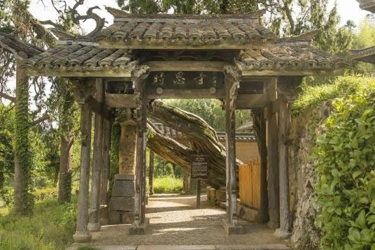 進(jìn)了山門(mén),邁上幾級(jí)臺(tái)階,有一個(gè)黃土砂礫鋪筑的小天地,右側(cè)有石臺(tái)階,通向枝桿蒼虬的柳杉王;左側(cè)是下坡道,通向時(shí)思寺的鐘樓與大殿;迎面是一堵砂石黃泥壘筑的儀門(mén),通向梅氏宗祠。